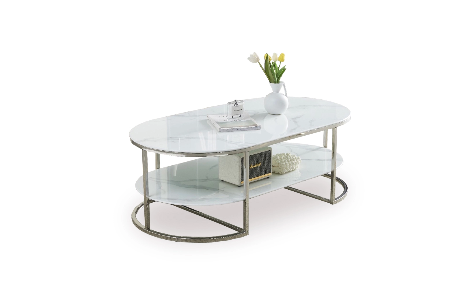 (1 avis)Table basse ovale double plateau couleur marbré blanc et acier inoxydable