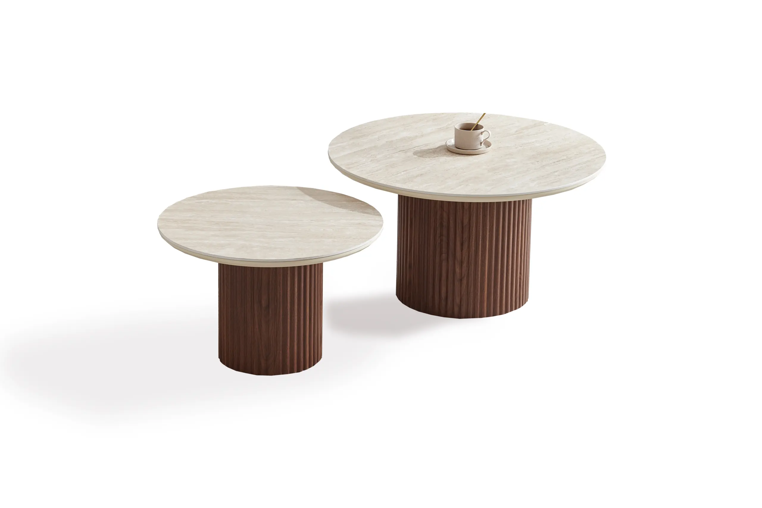 (1 avis)Tables gigognes ronde en céramique effet noyer et travertin