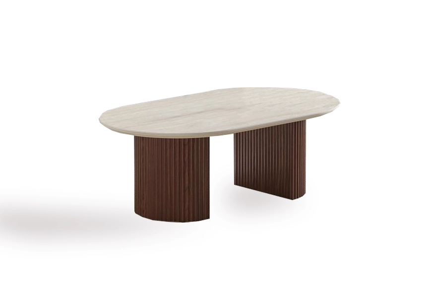 (1 avis)Table ovale en céramique effet noyer et travertin