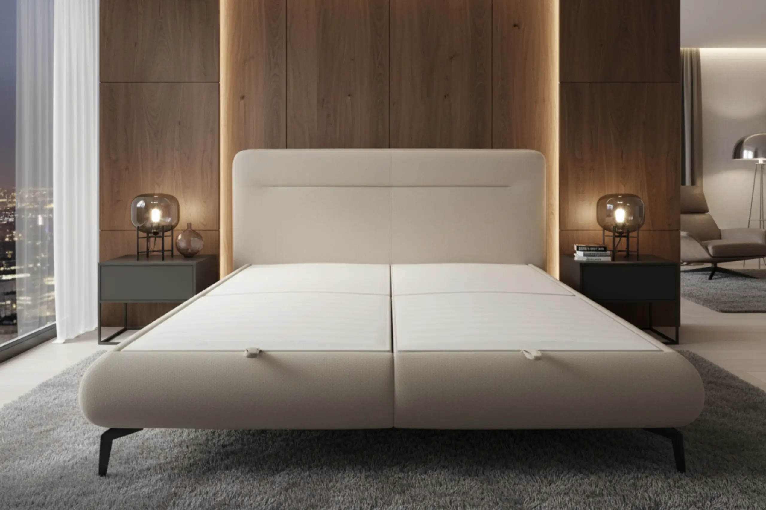 Le lit coffre double EMILIA allie élégance contemporaine, confort haut de gamme et praticité. Conçu pour les amateurs de design épuré, il s’intègre parfaitement dans une chambre moderne grâce à ses lignes harmonieuses, son tissu doux et sa structure de type lit continental.