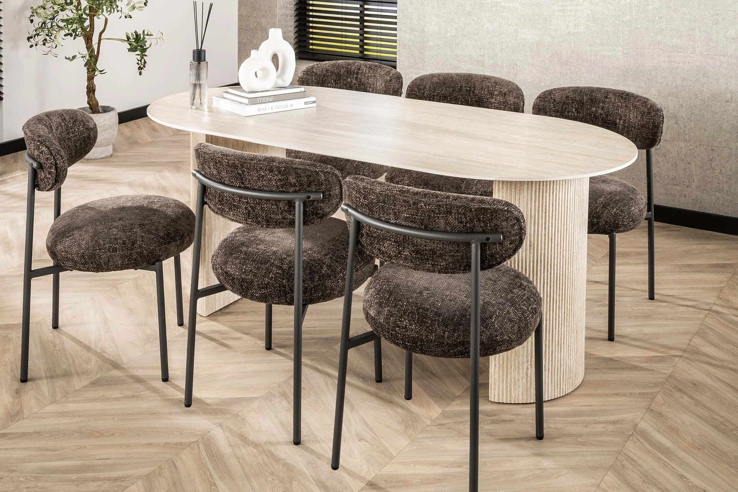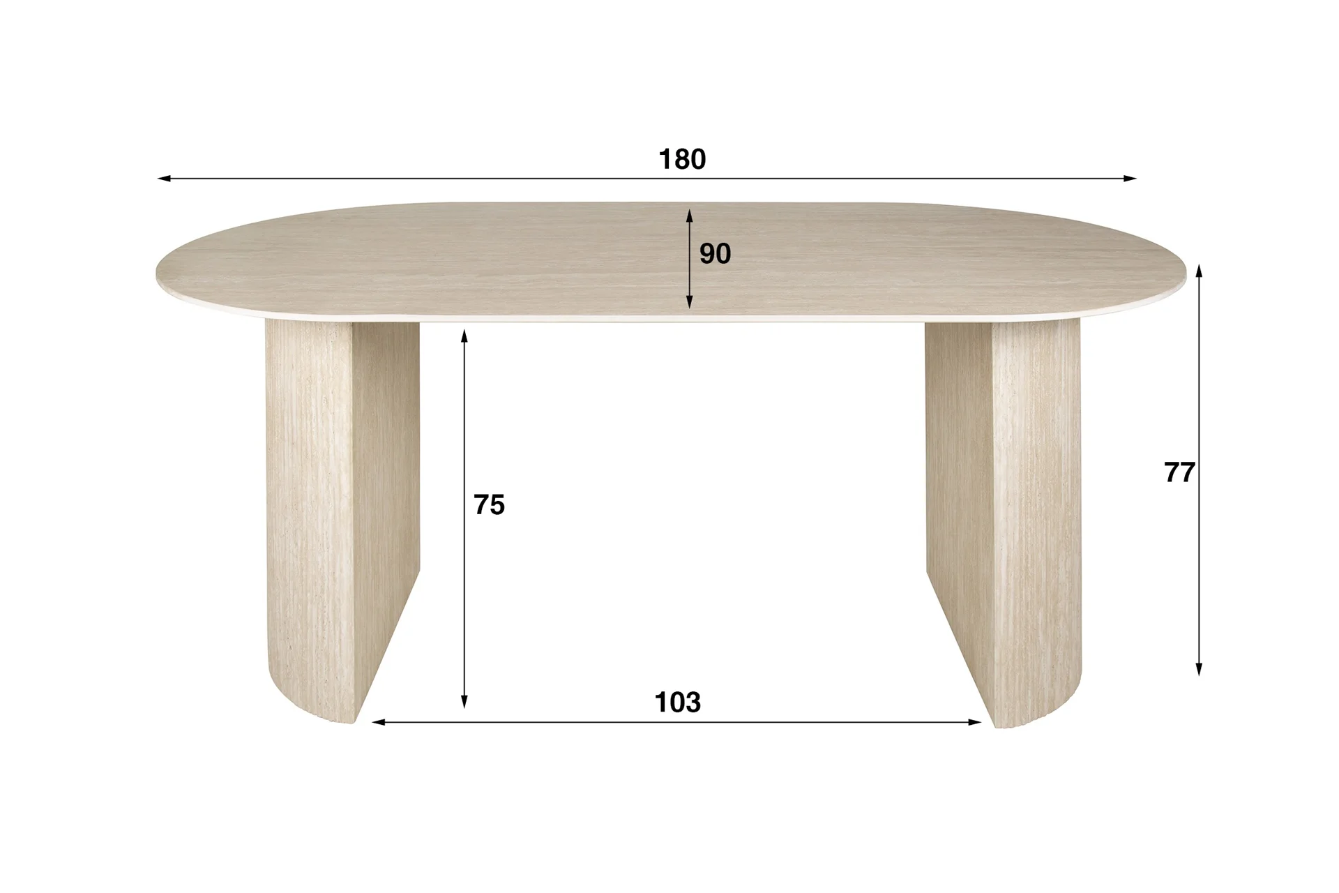 Son plateau ovale de 180 cm aux contours épurés repose sur deux pieds en demi-lune au galbe contemporain, signature architecturale de la série Joy. Cette silhouette aérienne et organique apporte autant de caractère qu’une œuvre d’art dans votre salle à manger.
