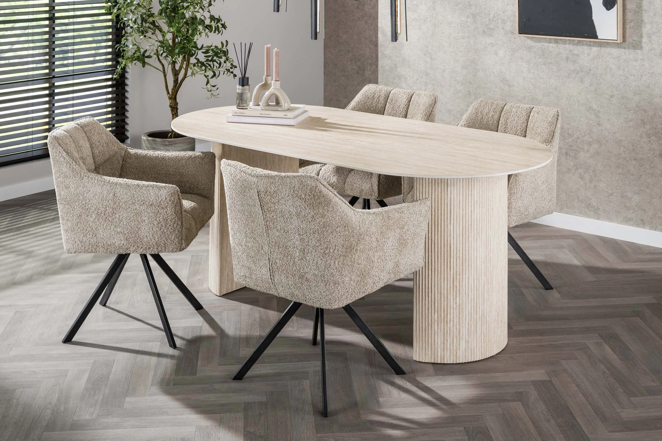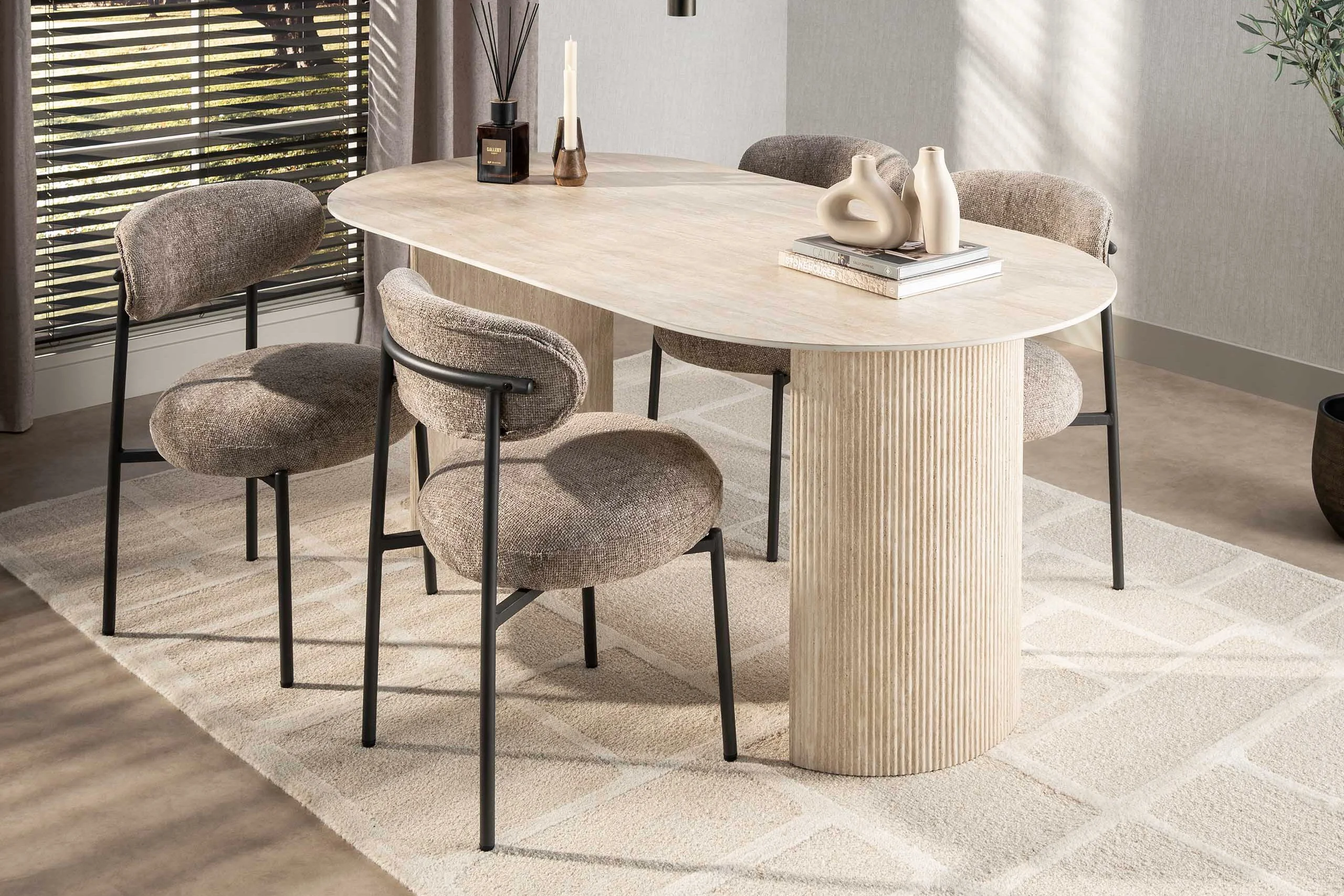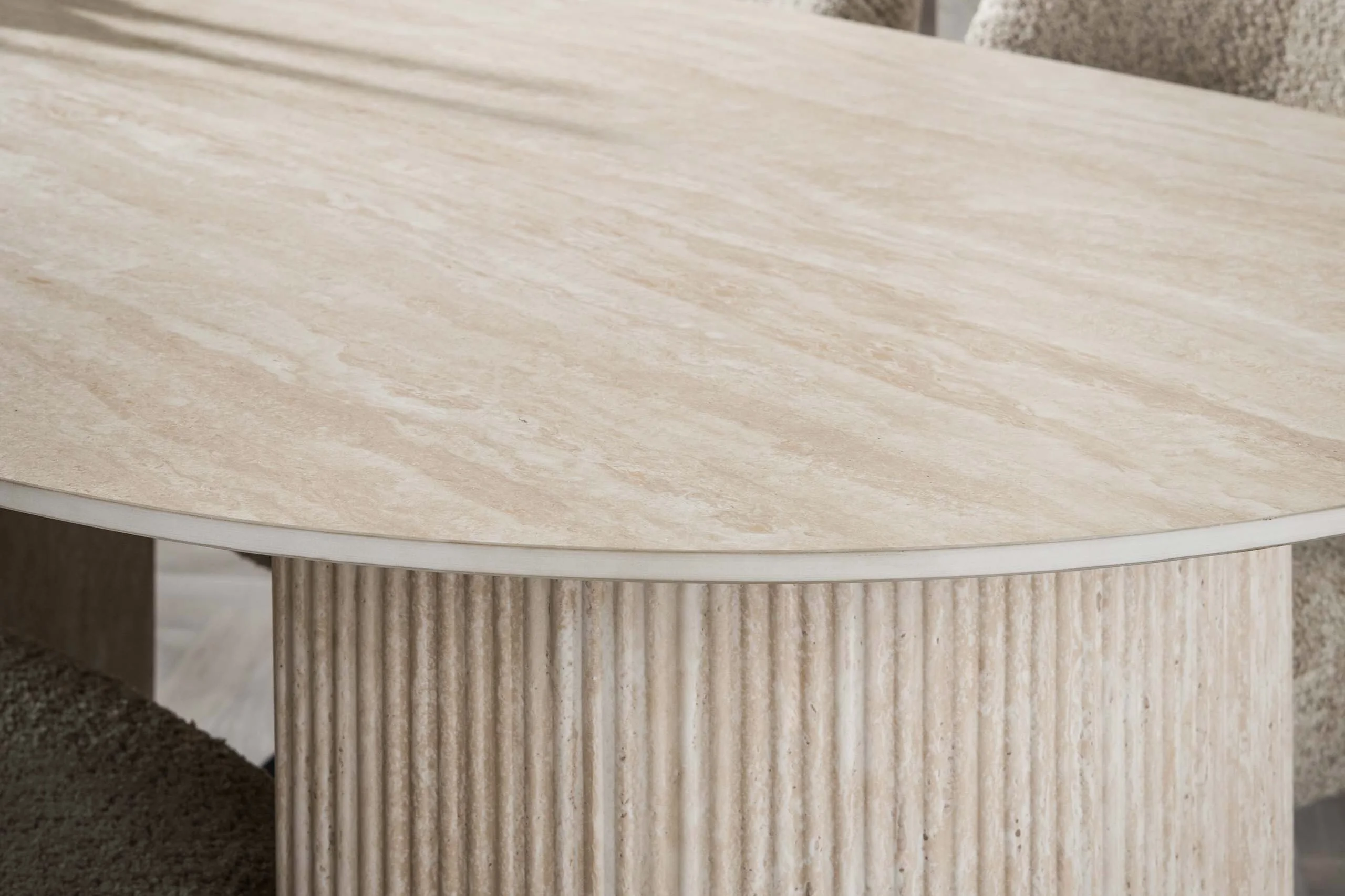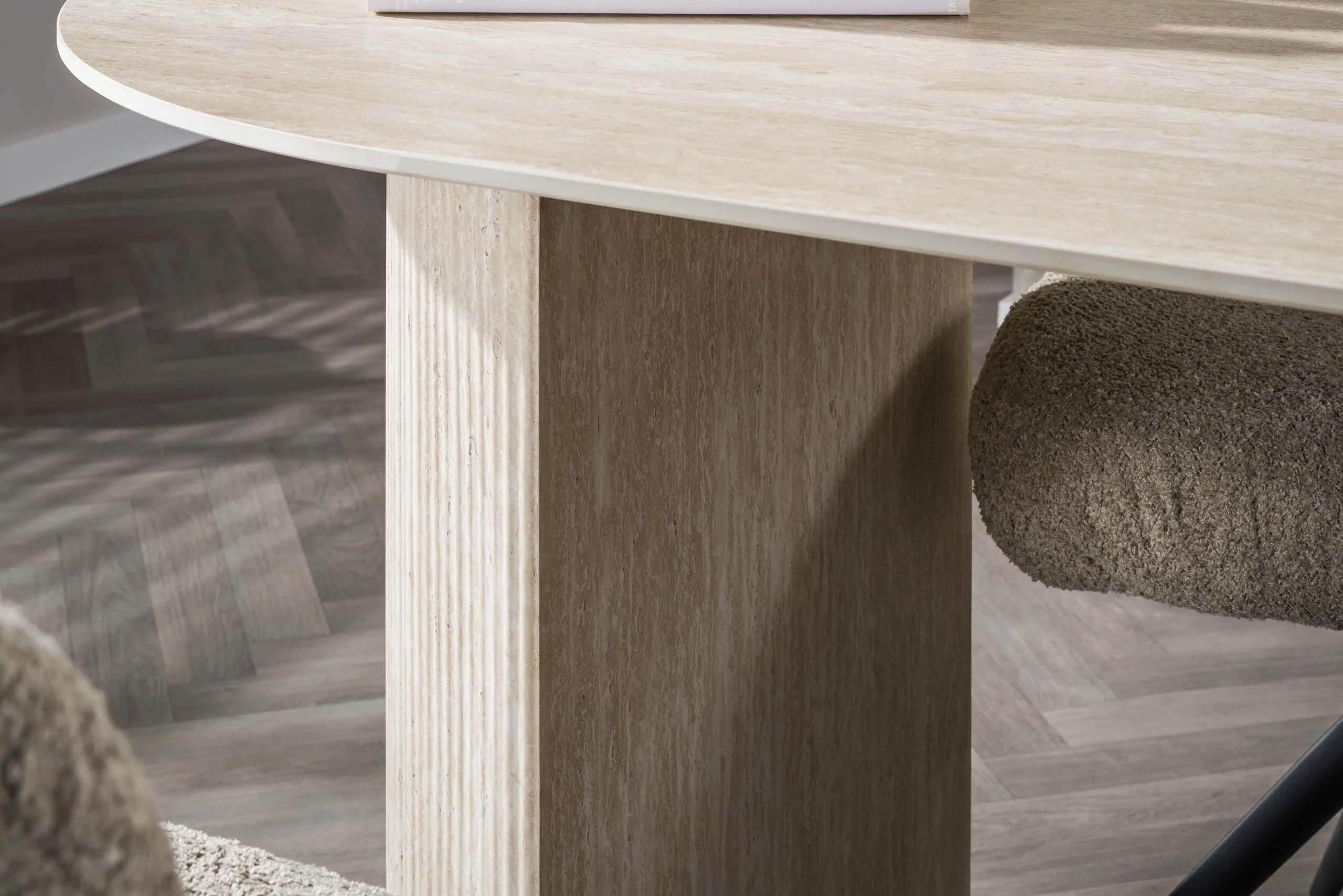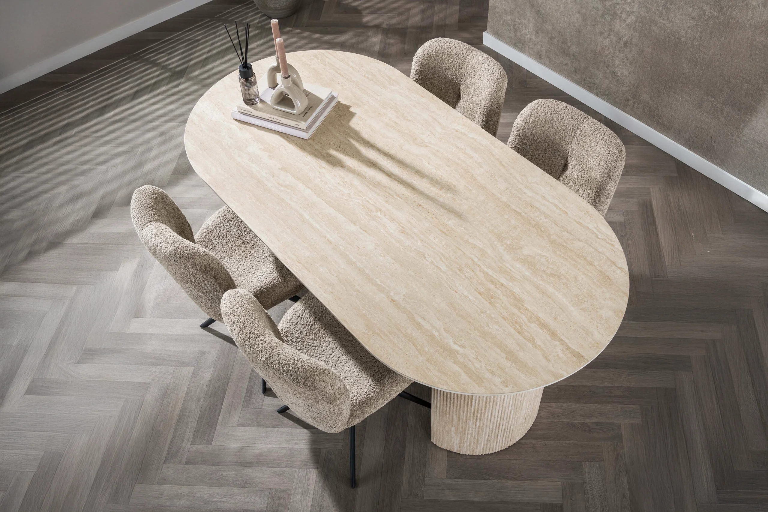 La table à manger Joy se distingue par son identité visuelle unique : plateau et piètement partagent le même décor céramique effet travertin sable, créant une pièce sculpturale d’une cohérence remarquable.