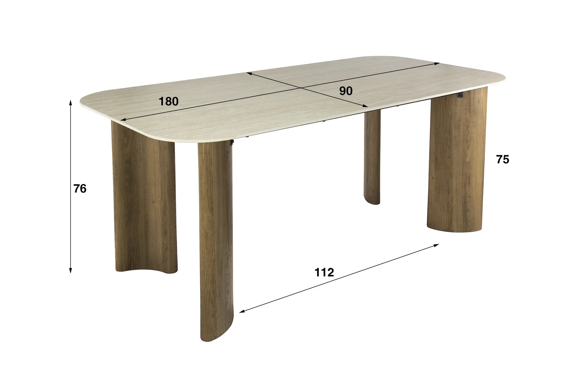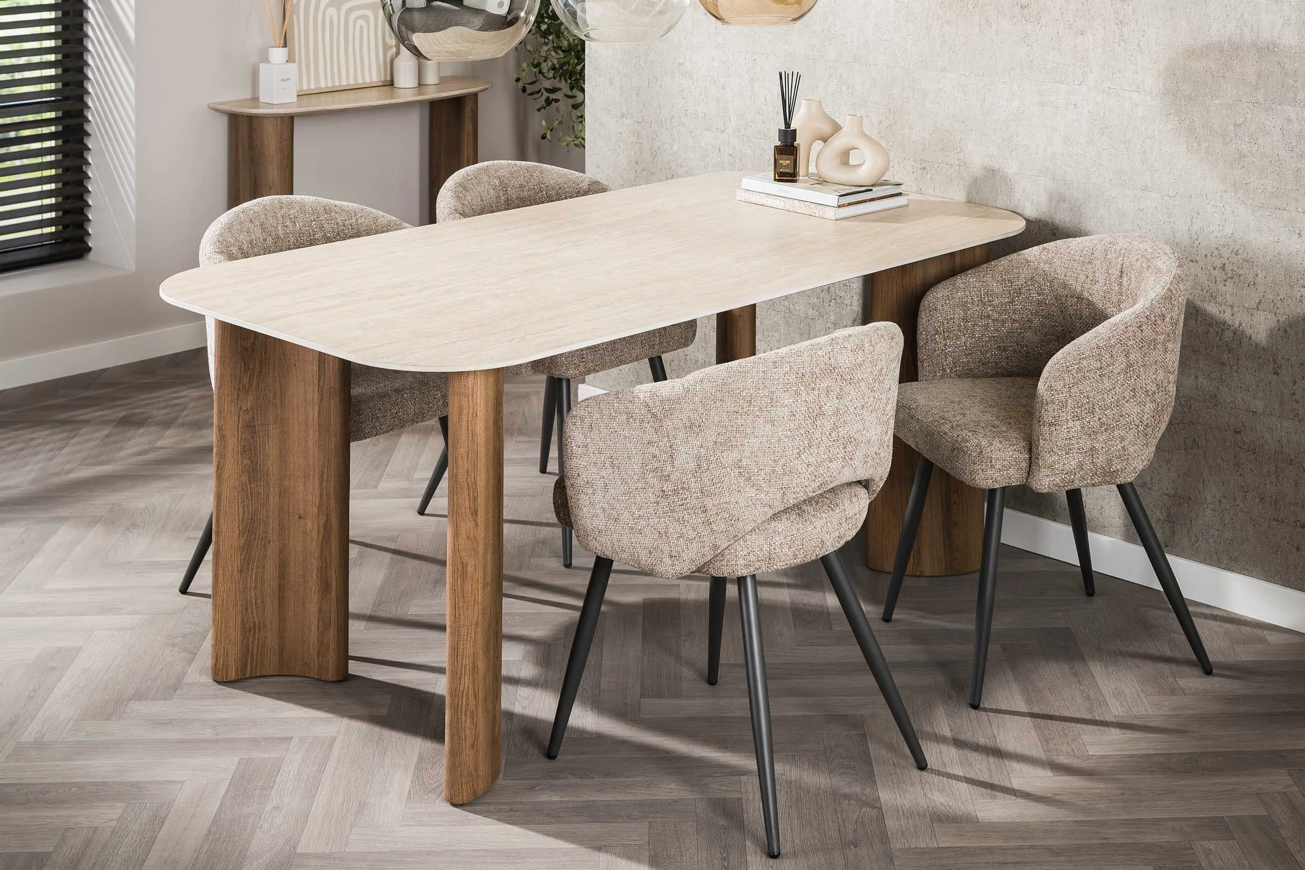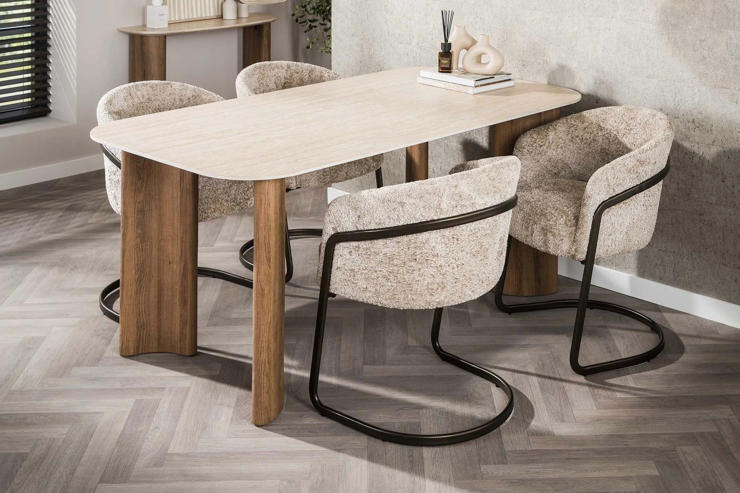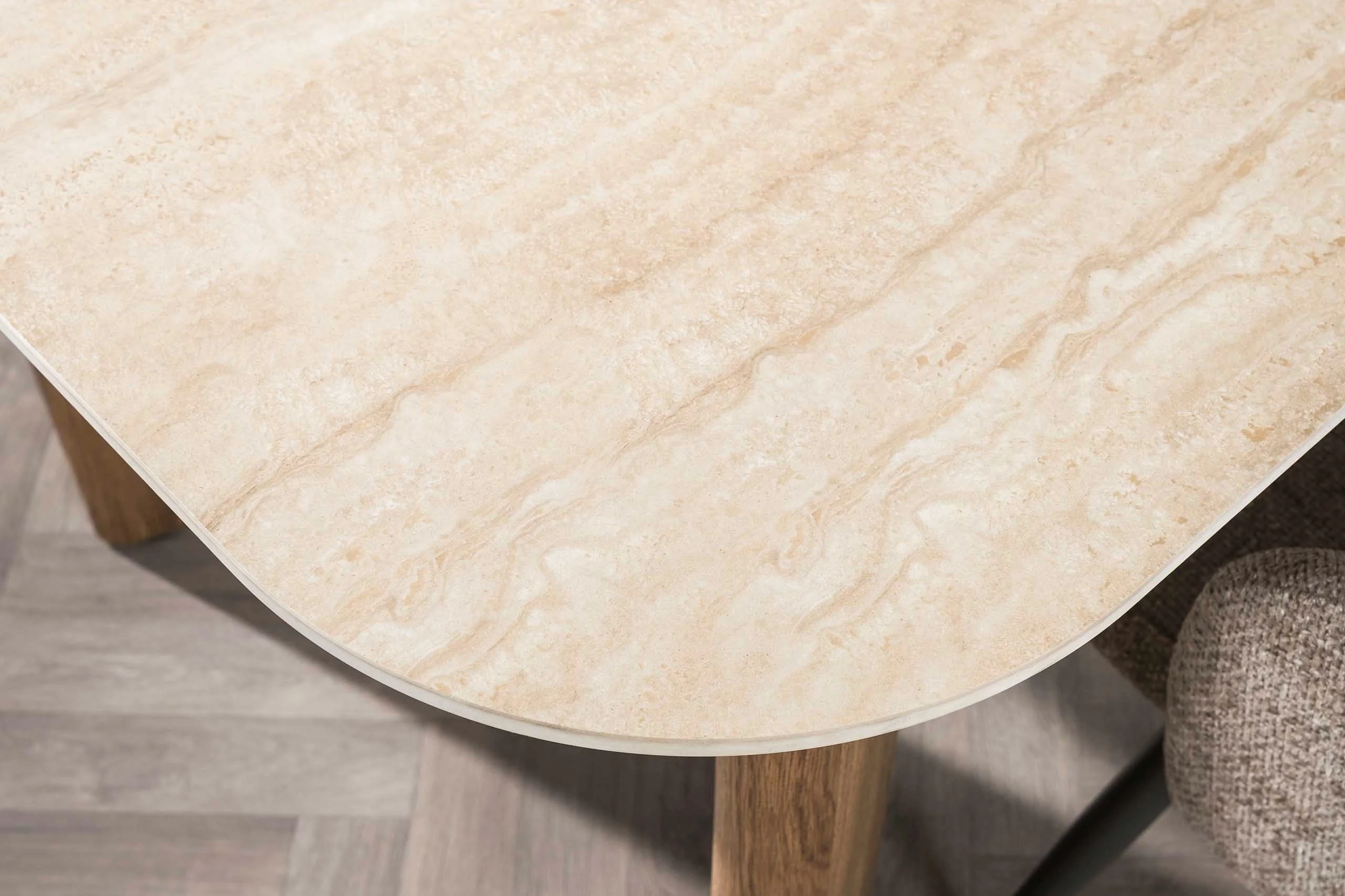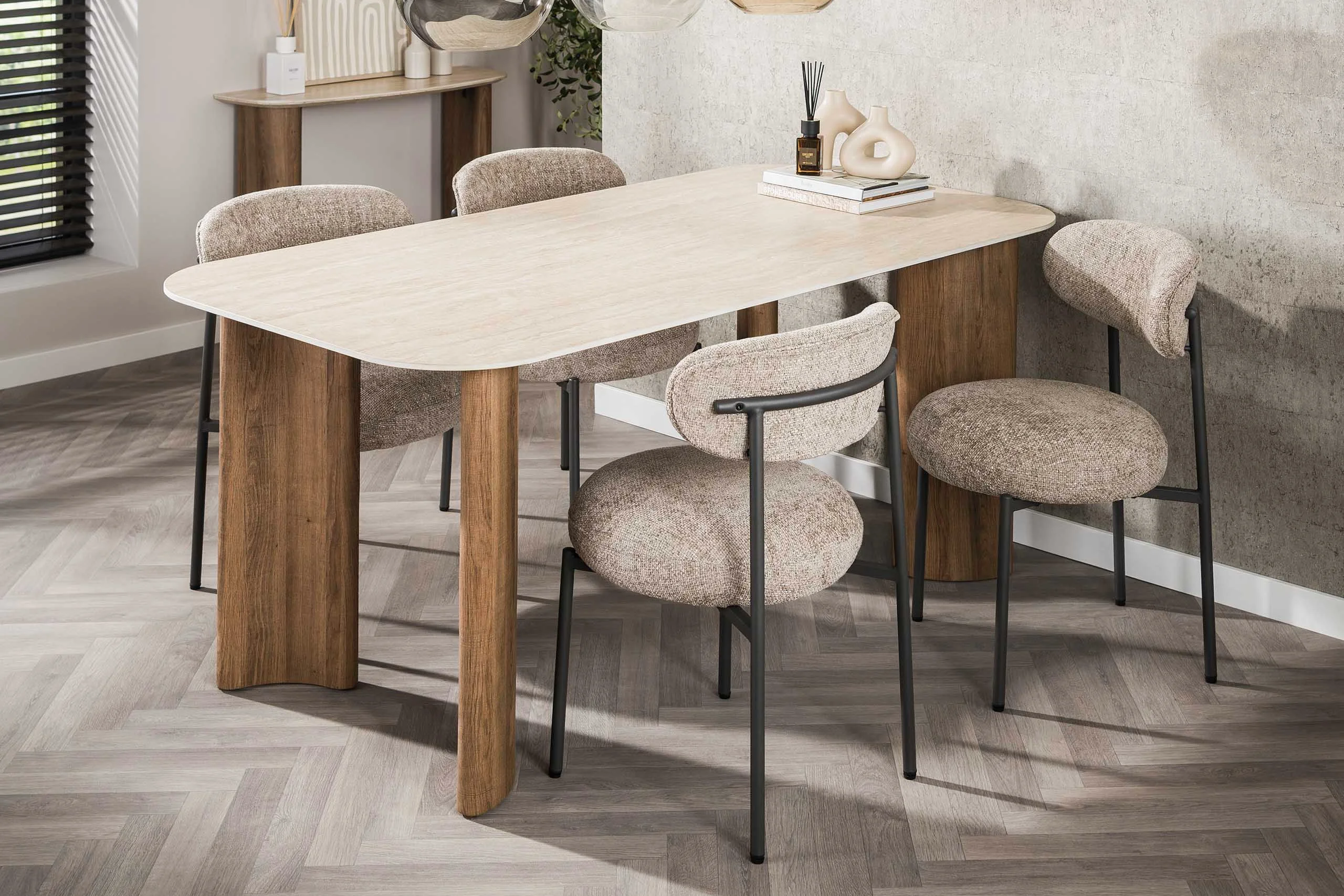 La table à manger Maryam associe la douceur des formes organiques à la robustesse de la céramique dans un design contemporain et chaleureux. Son plateau rectangulaire de 180 cm aux angles généreusement arrondis, réalisé en céramique imitation travertin, apporte la noblesse du minéral dans votre salle à manger.
