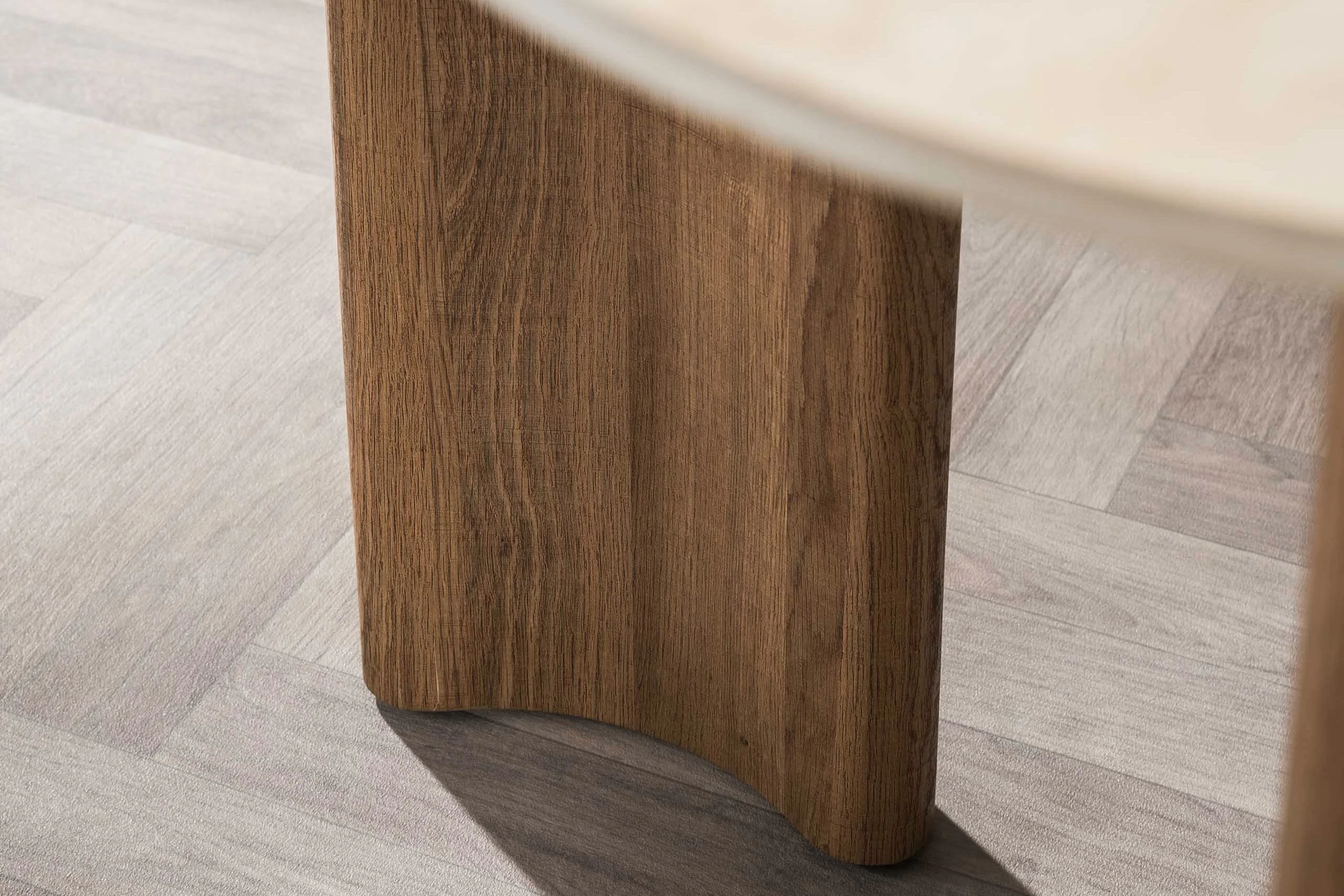 Les quatre pieds courbés imitation chêne — véritable signature de la Maryam — insufflent un mouvement organique et une chaleur naturelle à l’ensemble. Leur galbe sculptural contraste élégamment avec la minéralité claire du plateau, dans un équilibre matière très tendance.