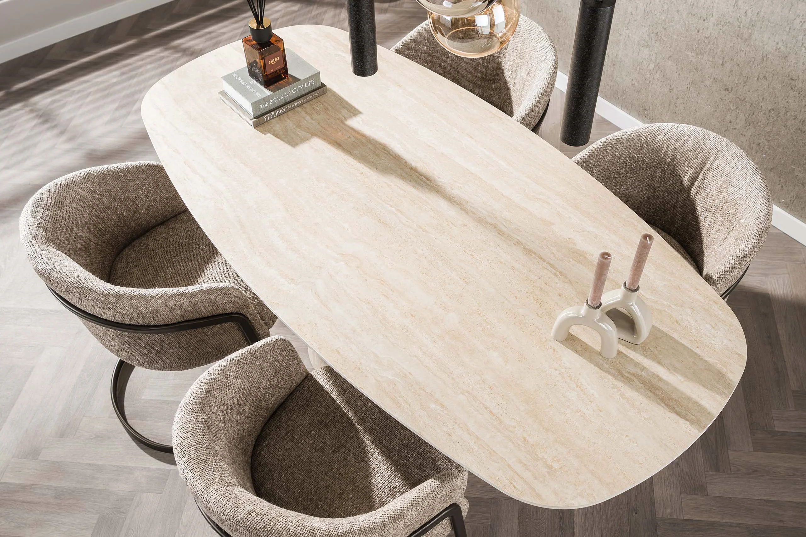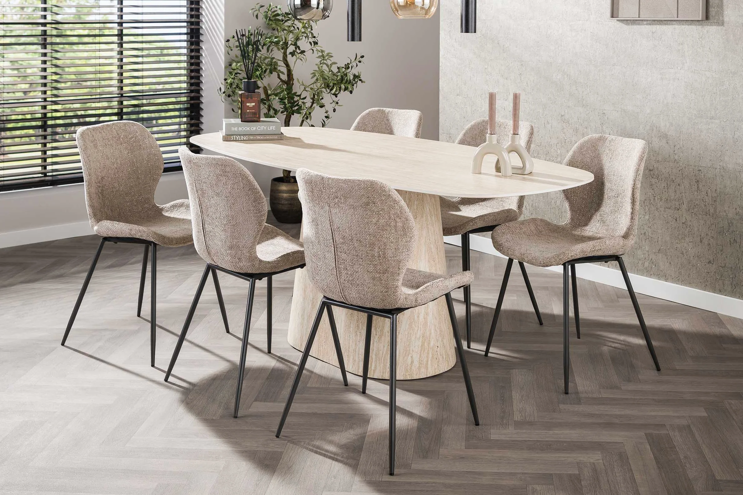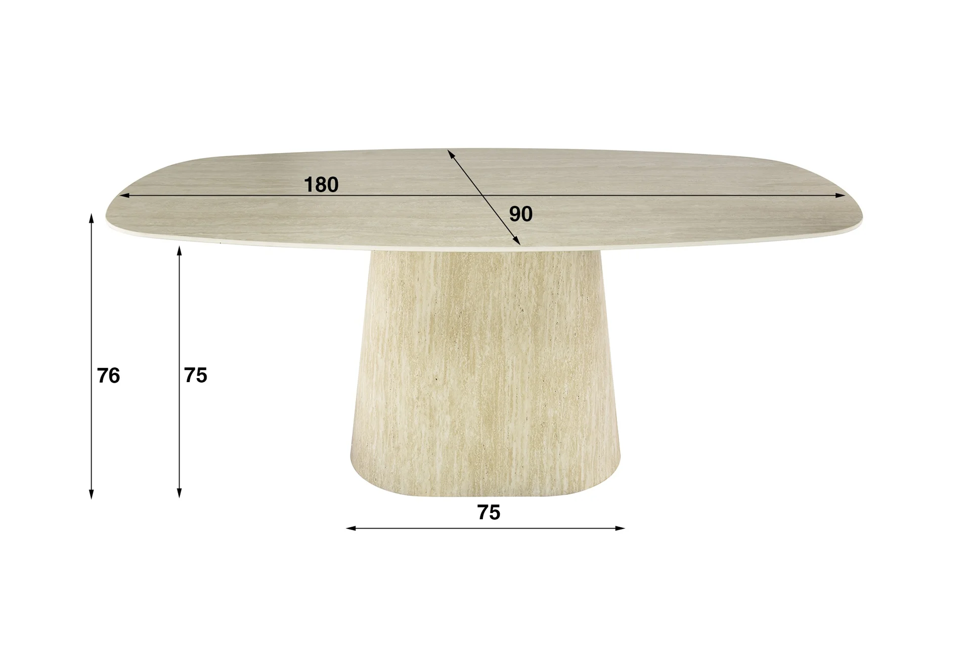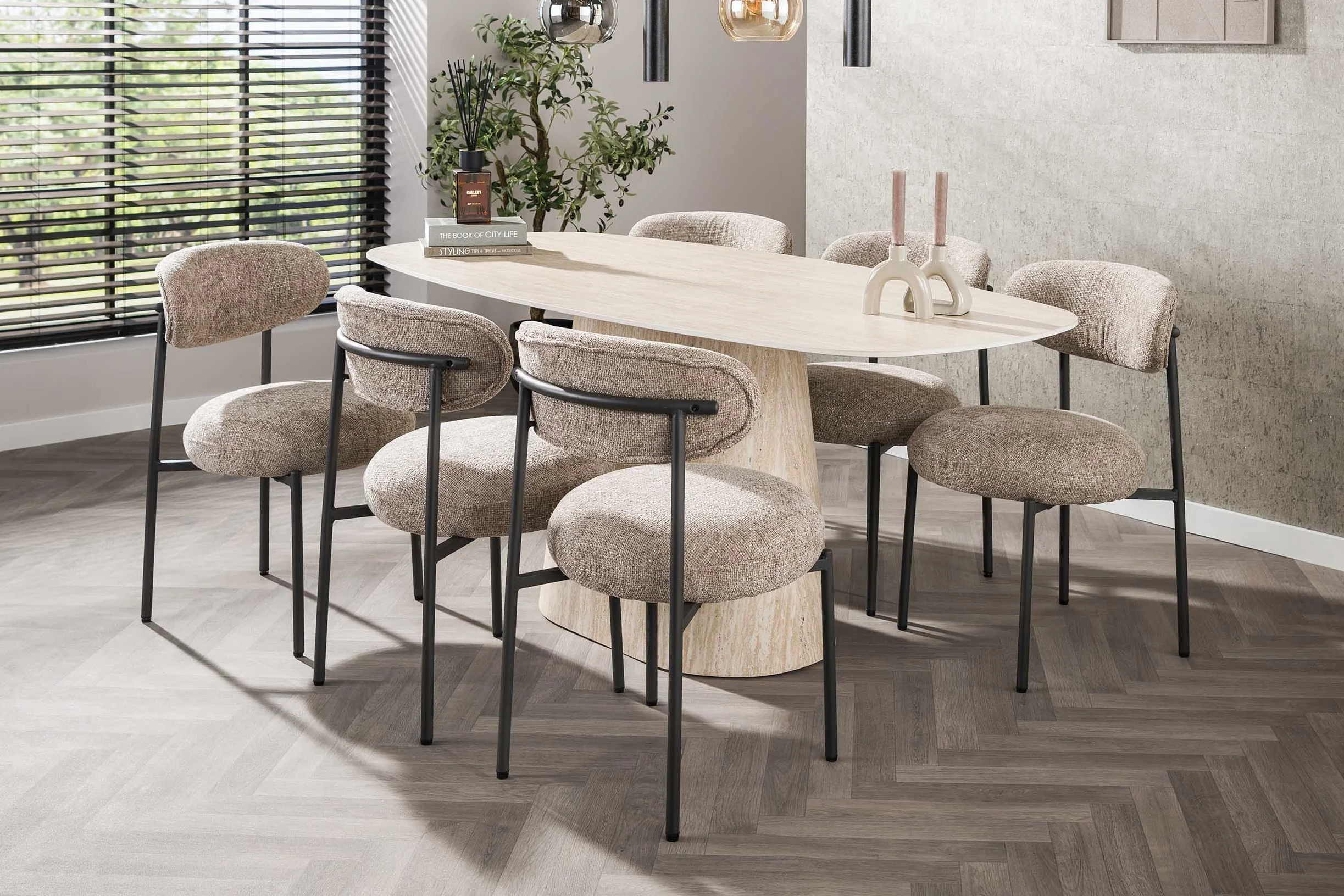 Son plateau ovale danois de 180 cm aux angles arrondis repose sur un piètement central tronconique au volume sculptural affirmé. Cette continuité de matière entre le dessus et le pied confère à la Roxane une présence quasi architecturale dans votre salle à manger.