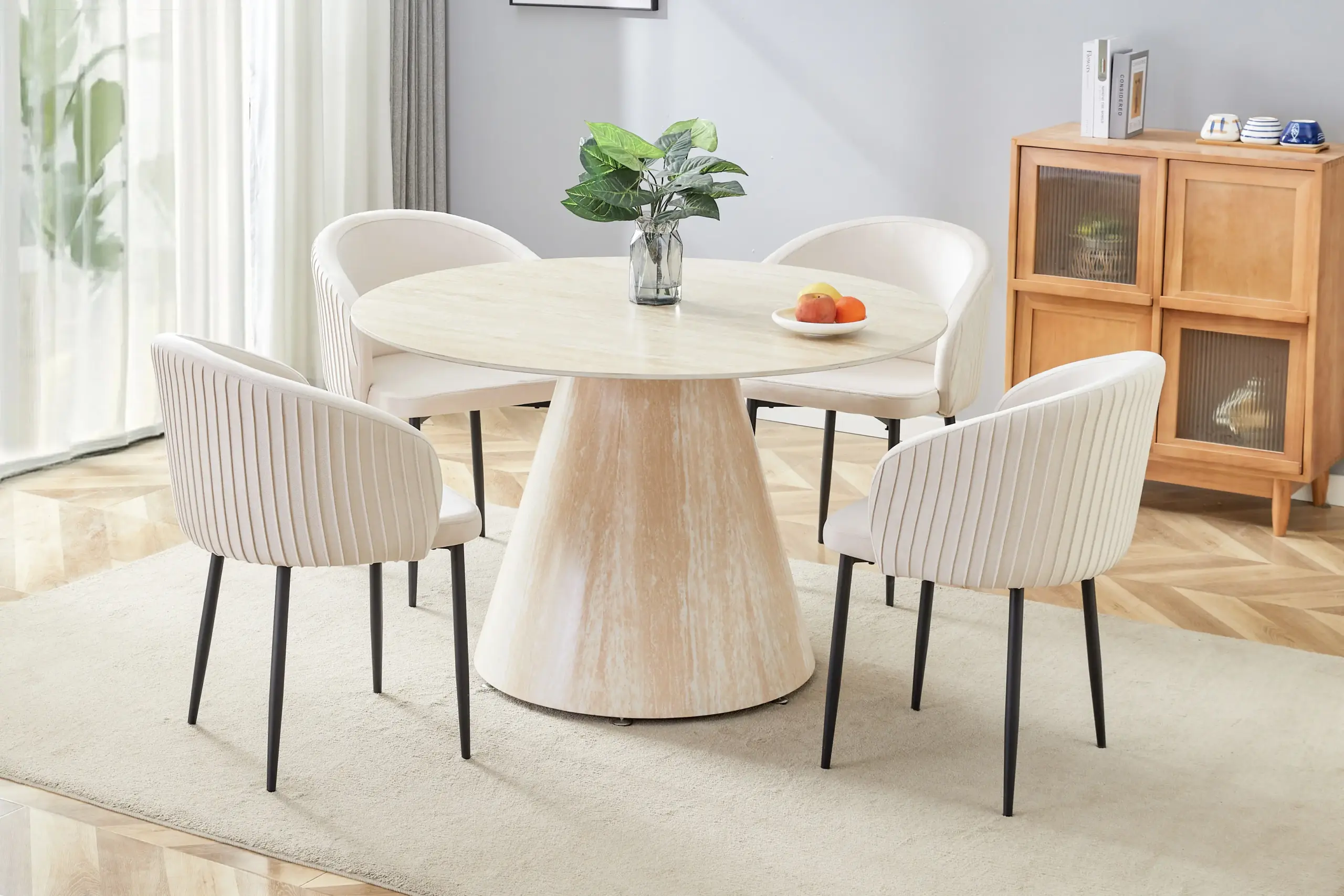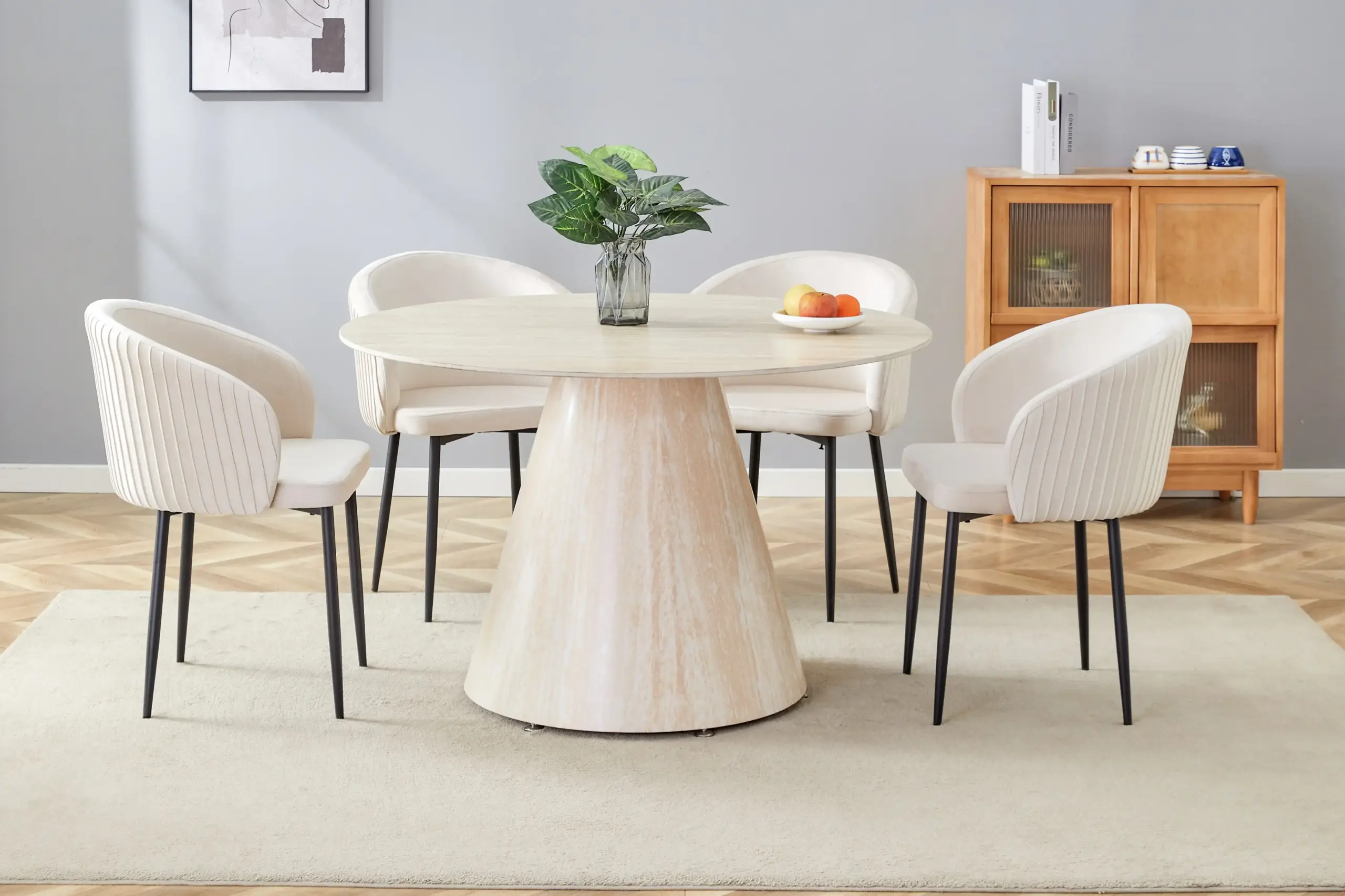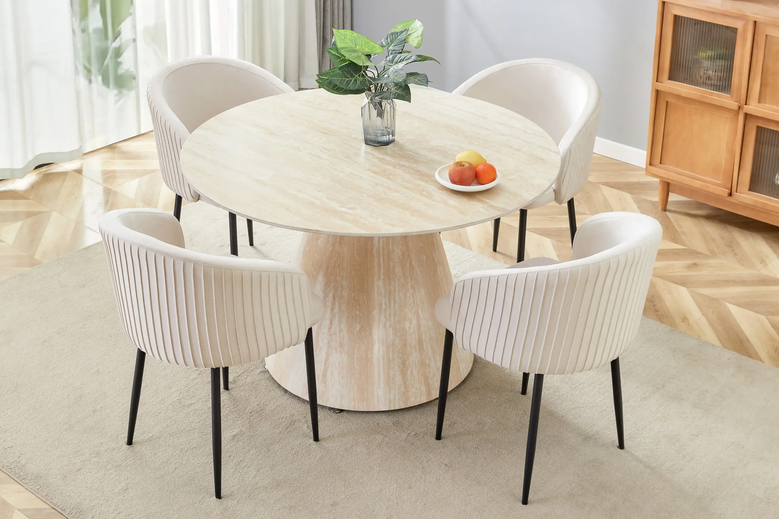 La table semble être réalisée en pierre naturelle, en travertin, avec une finition polie au toucher doux. Son veinage délicat et sa teinte beige clair rappellent les nuances du travertin clair ou du marbre crème, conférant à l’ensemble une esthétique à la fois luxueuse et chaleureuse.