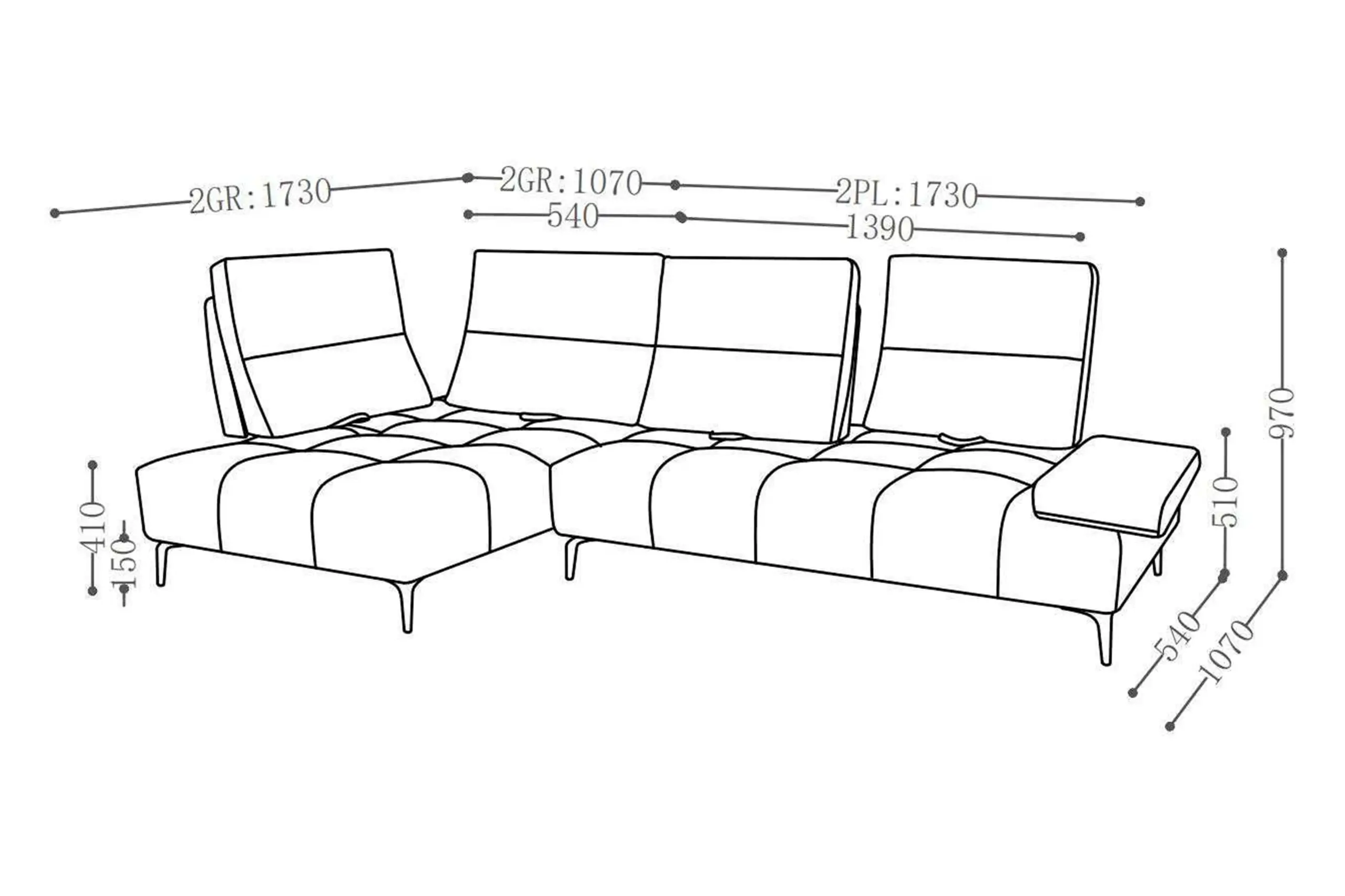 Largeur totale du canapé (dossier de méridienne ouvert et accoudoir ouvert) : 330 cm