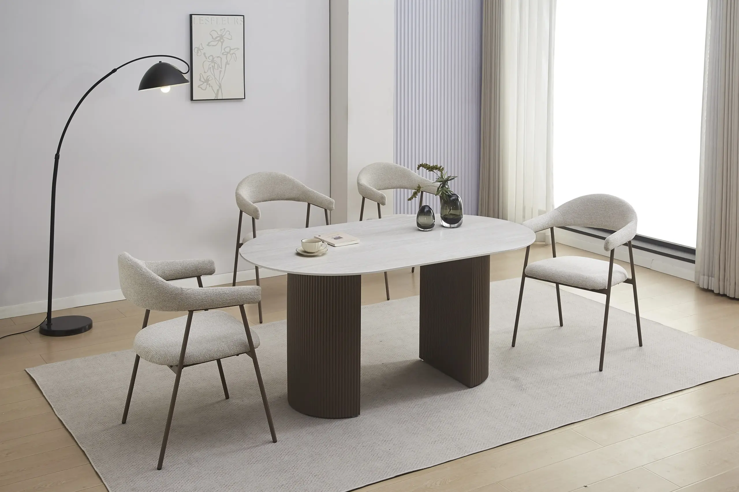 La combinaison du plateau clair et des pieds marron foncé offre un contraste élégant, permettant d’intégrer facilement cette table dans une décoration moderne, contemporaine ou même japandi. Son format ovale facilite la circulation autour de la table et favorise une ambiance plus chaleureuse lors des repas.