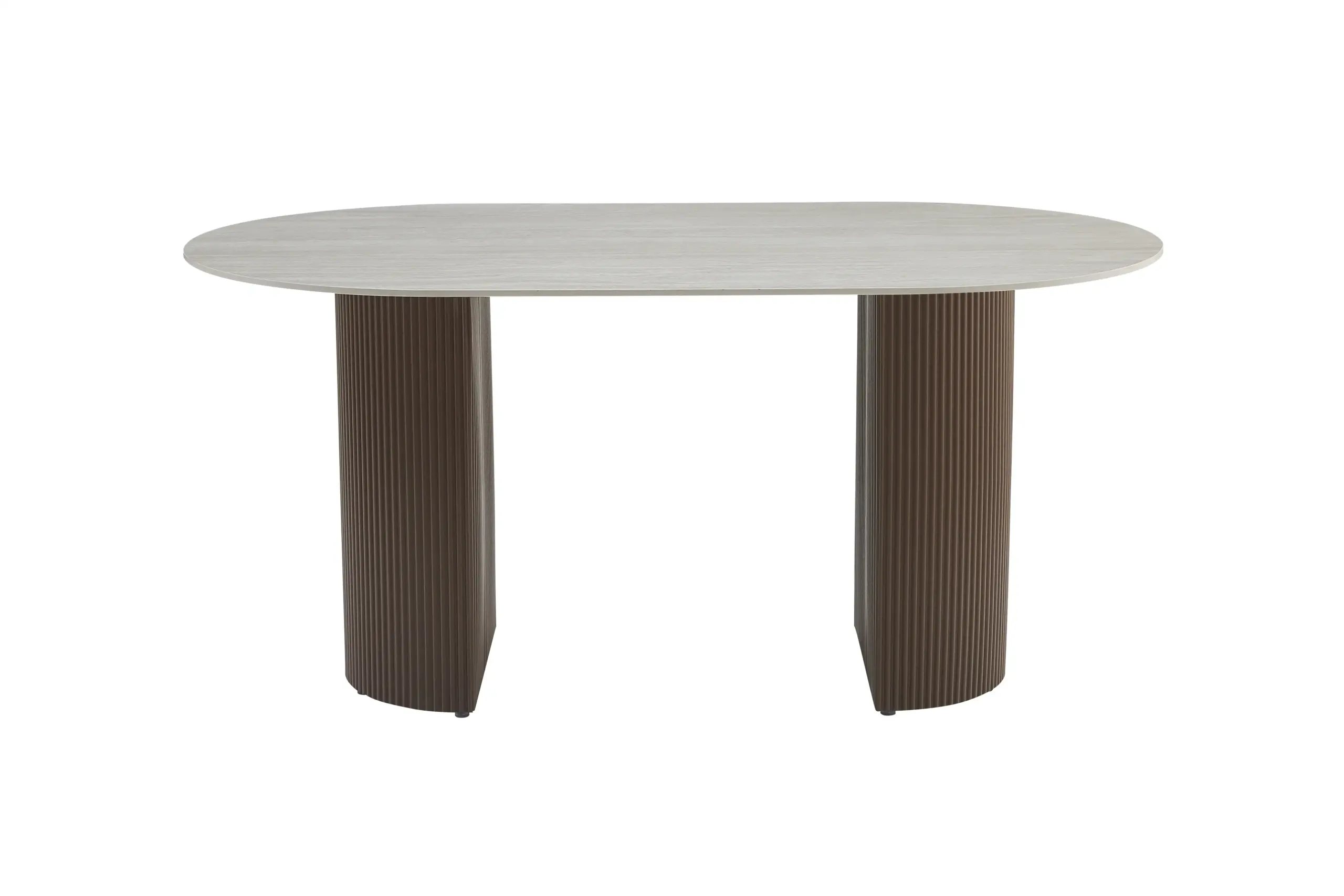 La particularité de cette table réside dans ses deux larges pieds cylindriques à relief vertical. Leur texture nervurée crée un jeu de lumière subtil et apporte une véritable dimension décorative. Ces bases imposantes assurent une excellente stabilité tout en renforçant l’identité visuelle de la table.